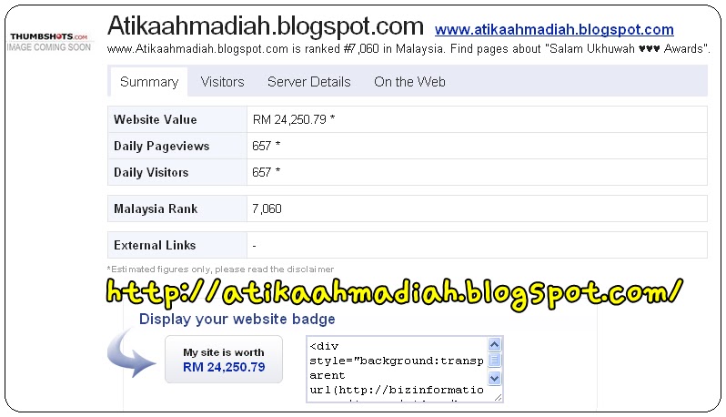 Cuba kawan-kawan cek blog masing-masing, agak-agak berapa nilainya..ni saya punya, saje2 je nak cek.
